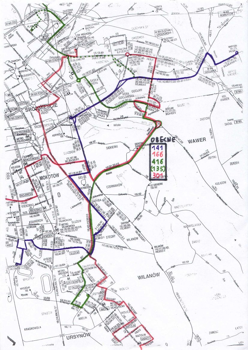 Trasa 301 na Mokotowie powinna być modyfikowana. Być może wiązałoby się to najpierw z powstaniem 168 i jednoczesnym pozostawieniem 301 w okrojonej postaci. Natomiast docelowo, zwłaszcza wobec niedawnego wydłużenia 138 na Służewiec (no i wobec faktu, że Jarek proponował 168 raczej na Ochotę), coś powinno przejąć połączenie Mokotowa z Okęciem. Pierwszym kandydatem jest tu 182, które można wtedy skierować trasą 301 przez Racławicką. Można też przez Waryńskiego i Rakowiecką.