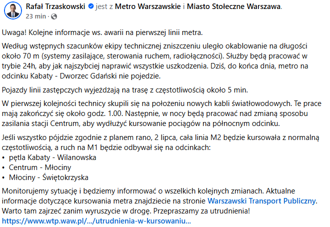 Jak tak to sorki. Chyba mi już starczy Internetu na ten miesiąc... jestem po solidnej dawce lektury komentarzy na facebooku na temat dzisiejszej awarii i wszelkich "znawców" więc i mój poziom załamania jest dość wysoki. Na przykład czytam sobie jak Trzaskowski od rana siedzi i kieruje pracami sztabu zarządzania kryzysowego, dał dość solidny komentarz i precyzyjną informację a ludzie mu piszą żeby zniknął. A jakby zniknął to ci sami ludzie by pisali że nie interesuje się Warszawą. No nie dogodzisz.