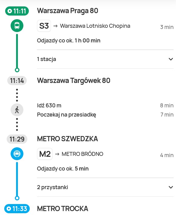 Bardzo dobre połączenie, jeśli przesiadka na 2 minutach wyjdzie (co jest wykonalne, o ile pociąg się nie spóźni, a pasażer dobrze zna układ wyjść z peronu na Toruńskiej). Jeśli zaś przesiadka nie wyjdzie, to pasażerowi zostaje pół godziny kwitnięcia w oczekiwaniu na kolejne 156 lub dość uciążliwe przepychanie się do M2 na Bródnie. W tej relacji bez cienia wahania pojechałbym z przesiadką na metro, bo połączenie jest regularnie powtarzalne i dowolne opóźnienie pociągu nie wpływa na możliwość kontynuowania podróży. Dopóki planery nie będą priorytetowo wskazywać połączeń bezpiecznych, dopóty będą praktycznie bezużyteczne i pogarszające renomę zbiorkomu w oczach pasażerów; tym bardziej że przecież wiele osób korzystających z tych cudów informatyzacji nie porusza się na tyle biegle w systemie transportowym, aby móc opisane przeze mnie ryzyko ocenić.