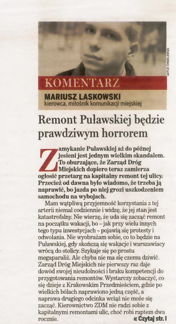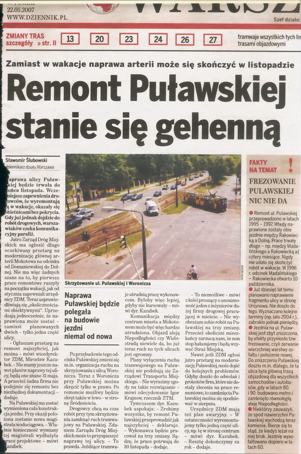 BTW. A czy przypadkiem Puławska nie będzie remontowana połówkowo, czyli najpierw jedną jezdnię (w tym czasie cały ruch odbywa się drugą) i na odwrót?