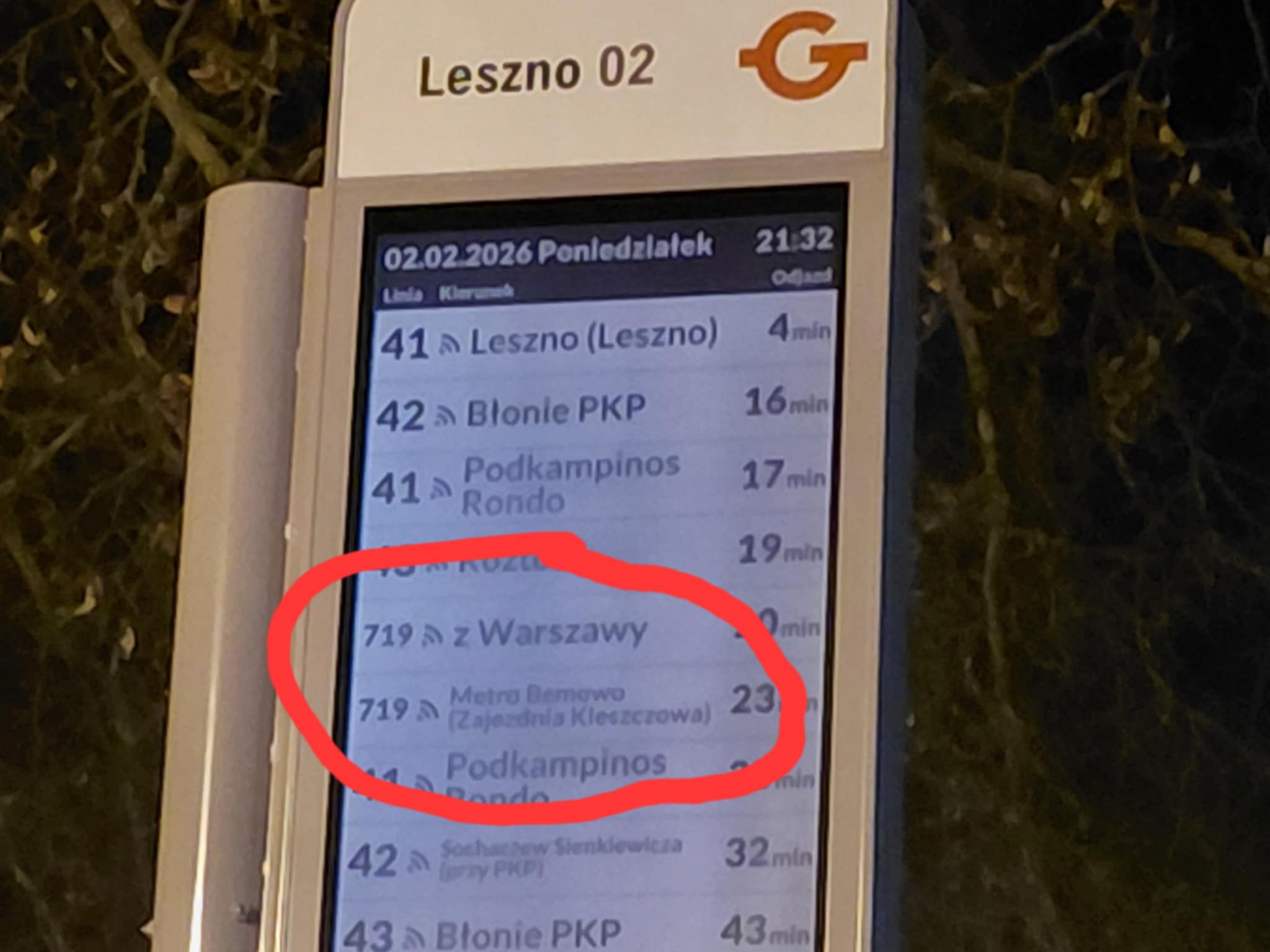 To ja wrzucę ciekawostkę. Tablica SIP na krańcu w Lesznie nie dość, że wyświetla odjazdy ale i przyjazdy 719, to jeszcze można z niej się dowiedzieć który kurs zjeżdża do zajezdni po dojeździe do metra.