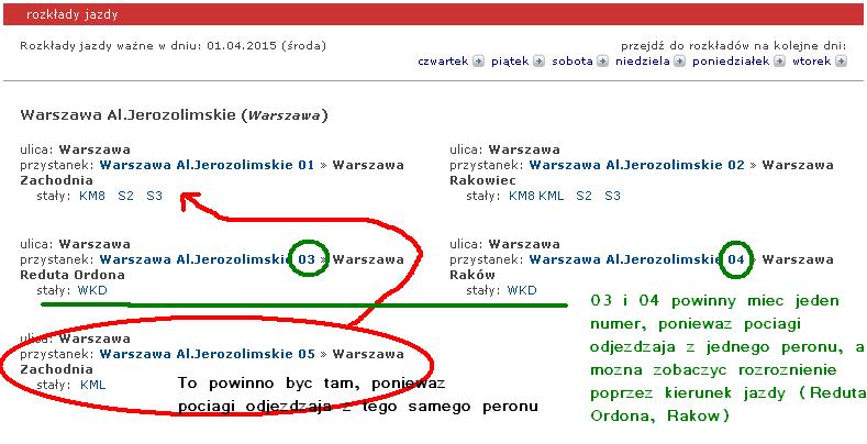 Przy czym 01 oznaczałoby peron po prostu. Moim zdaniem to by było czytelniejsze. No bo jeżeli dla ZTMu tory przy peronach to inne przystanki, to powoduje niepotrzebne zamieszanie, bo nie da się sprawdzić dla peronu wszystkich odjazdów.