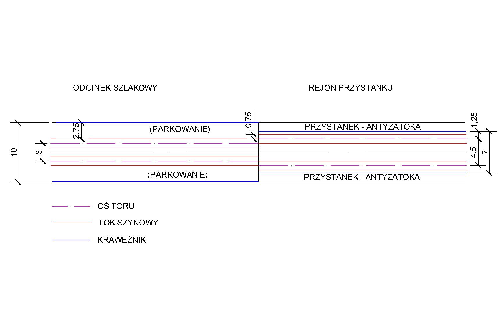 Żeby jezdnia nie była przy tym za wąska (magiczne 7 metrów), to trzeba trochę rozsunąć tory - normalnie mają rostaw 3 metrów, w tym miejscu będa miały rozstaw 4,50 (wagon jest węższy od pasa ruchu a powinien być dosunięty do krawężnika).