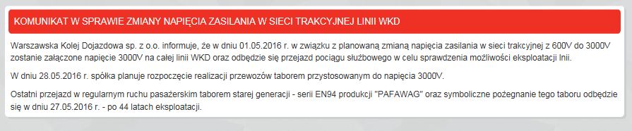 WKD pisze:Warszawska Kolej Dojazdowa sp. z o.o. uprzejmie informuje, że w dniu 21.05.2016 r. (sobota) na linii WKD po raz ostatni pojawią się w ramach rozkładu jazdy dla dni wolnych od pracy elektryczne zespoły trakcyjne serii EN94. Pojazdy obsłużą regularne kursy przewidziane w obowiązującym rozkładzie jazdy.
