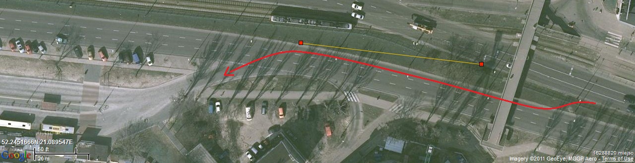 Natomiast łuk powstały przy wybudowaniu dodatkowej jezdni oznaczonej na zdjęciu żółtą linią nie jest taki znów ciasny. Z kolei koszt inwestycji (w którym trzeba także zawrzeć odwrócenie kierunku miejsc postojowych na pętli - również niedawno remontowanej) zapewne w końcu zwróciłby się w zaoszczędzonej benzynie :p