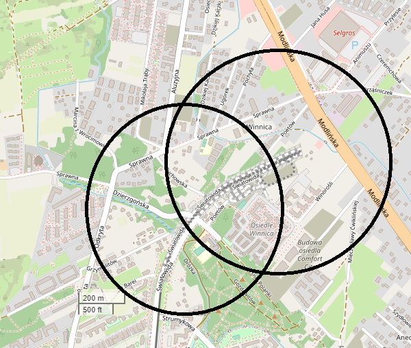 Mocno na oko zrobiłem około 500-metrowe strefy dojścia do dwóch przystanków "w polu". Jest w niej większość patodeweloperki Sprawna/Aluzyjna i okolice, a takze osiedle Winnica.